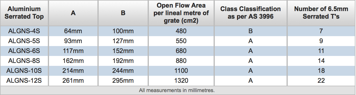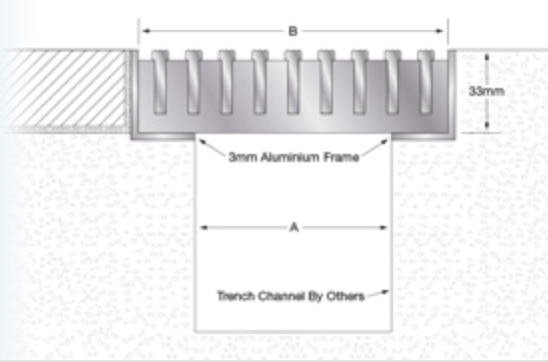 The ALGNS Series serrated top aluminium trench grates are for pedestrian applications. They are commonly used in office building entrances, home, parks, recreational harbour or beach foreshores, casinos, convention centres, exhibition centres, schools, hospitals, hotels etc. They are designed to sit over a preformed trench and require a 36mm deep x 25mm wide bearing platform on each side of the trench. The 3mm narrow view aluminium frame is mechanically fixed to the bearing platforms and the edge of the frame and grate should finish level with the surrounding floor finish.