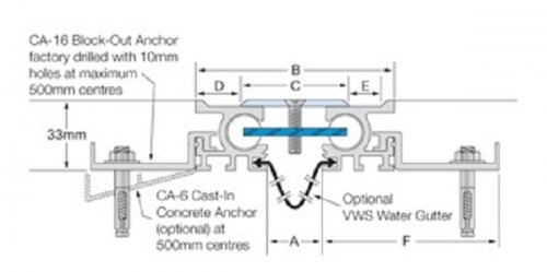 The Latham Ultimate Series Standard 33mm deep floor expansion joint covers are available with aluminium and stainless steel cover plates; this series can carry a VWS water gutter if required. The series has a depth below the finished floor height of 33mm. The series can be set into a preformed recess with CA-16 Block-Out Anchors (supplied unless otherwise noted), in conjunction with mechanical fixings, or cast-into the slab when it is poured, with CA-6 Cast-In Anchors.