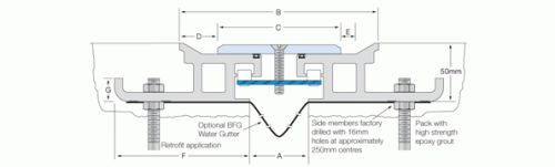 The series is designed to be set into a pre-formed recess, in conjunction with mechanical fixings, and has stainless steel cover plates. This series can carry a water gutter if required and can either be cast into the slab or set into a preformed recess. When the expansion joint width is 50mm or wider, the recess can accommodate the Latham Fire Barrier System. For this system contact Latham Australia Pty Ltd before specifying with details of maximum loading, wheel diameter, width and type.