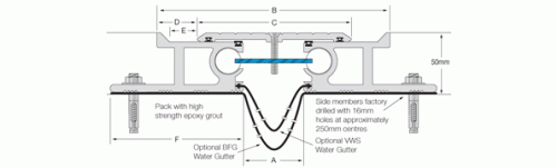 The Series is designed to be set into a pre-formed recess, in conjunction with mechanical fixings. The Series is available with stainless steel or aluminum (ribbed) cover plates and this series can carry a water gutter if required. When the expansion joint width is 50mm or wider, the recess can accommodate the Latham Fire Barrier System.
