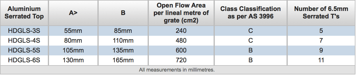 HDGLS Series serrated top aluminium trench grates are suitable for vehicular traffic in light duty applications, such as residential driveways, parks, recreational harbour or beach foreshores, schools, hospitals, hotels, car showrooms, arenas and stadiums etc. They are specifically designed for car and light commercial traffic and although not considered suitable for public roadway applications, they will accommodate heavier traffic on irregular occasions, such as occasional access for emergency vehicles etc. The HDGLS is designed for somewhat heavier applications than the standard Lathamgrate™ range. This range has slightly closer spaced cross supports at a maximum of 200mm centres and the cross support is of heavier construction, although this is unnoticeable when the grates are in application.