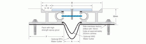 The Series is designed to be set into a pre-formed recess, in conjunction with mechanical fixings. The Series is available with stainless steel or aluminium (ribbed) cover plates and this series can carry a water gutter if required. When the expansion joint width is 50mm or wider, the recess can accommodate the Latham Fire Barrier System.