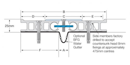 The Latham Ultimate Series Surface Fixed 25mm Deep floor expansion joint covers are available with aluminium and stainless steel cover plates; this series can carry a BFG water gutter if required. The series has a depth below the finished floor height of 25mm. The series is designed to be installed in a retro fit application when an expansion joint cover has been left out of the design or installation and it needs to be cut in later. This system offers relatively easy and quick retro fit application and does not require the surrounding floor finish to be removed. When the installation structural joint width exceeds 50mm the series can accommodate the Latham Fire Barrier System.