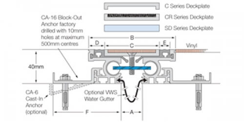 The Latham Flat-line Series Resilient Insert 40mm deep floor expansion joint covers are available with aluminum and stainless steel cover plates. The cover plate can have either a flat aluminum or stainless steel, recessed for vinyl, or slip resistant abrasive-filled insert. This series can carry a water gutter if required. They can be set into a pre-formed recess with CA-6 Block-Out Anchors, in conjunction with mechanical fixings, or cast into the slab when it is poured, with CA-6 Cast-In Anchors.