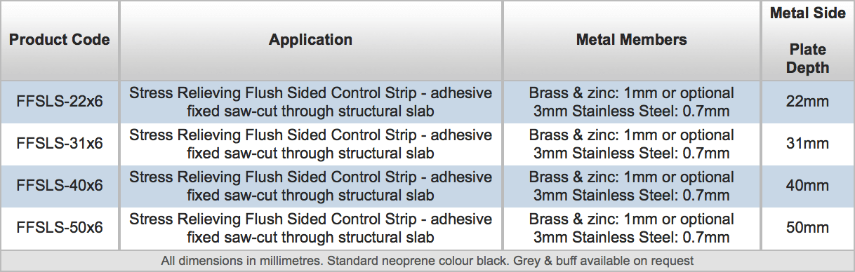 Control Strips are supplied with the following metal sideplate thicknesses: standard brass & zinc products – 1mm thick; stainless steel type 304 – 0.7mm thick (note: stainless steel products are not recommended for finish to be ground insitu). Optional 3mm thick brass & zinc sideplates are also available, specify with 3mm sideplates when ordering: Brass: TBLSB3mm / Zinc: TBLSZ3mm.